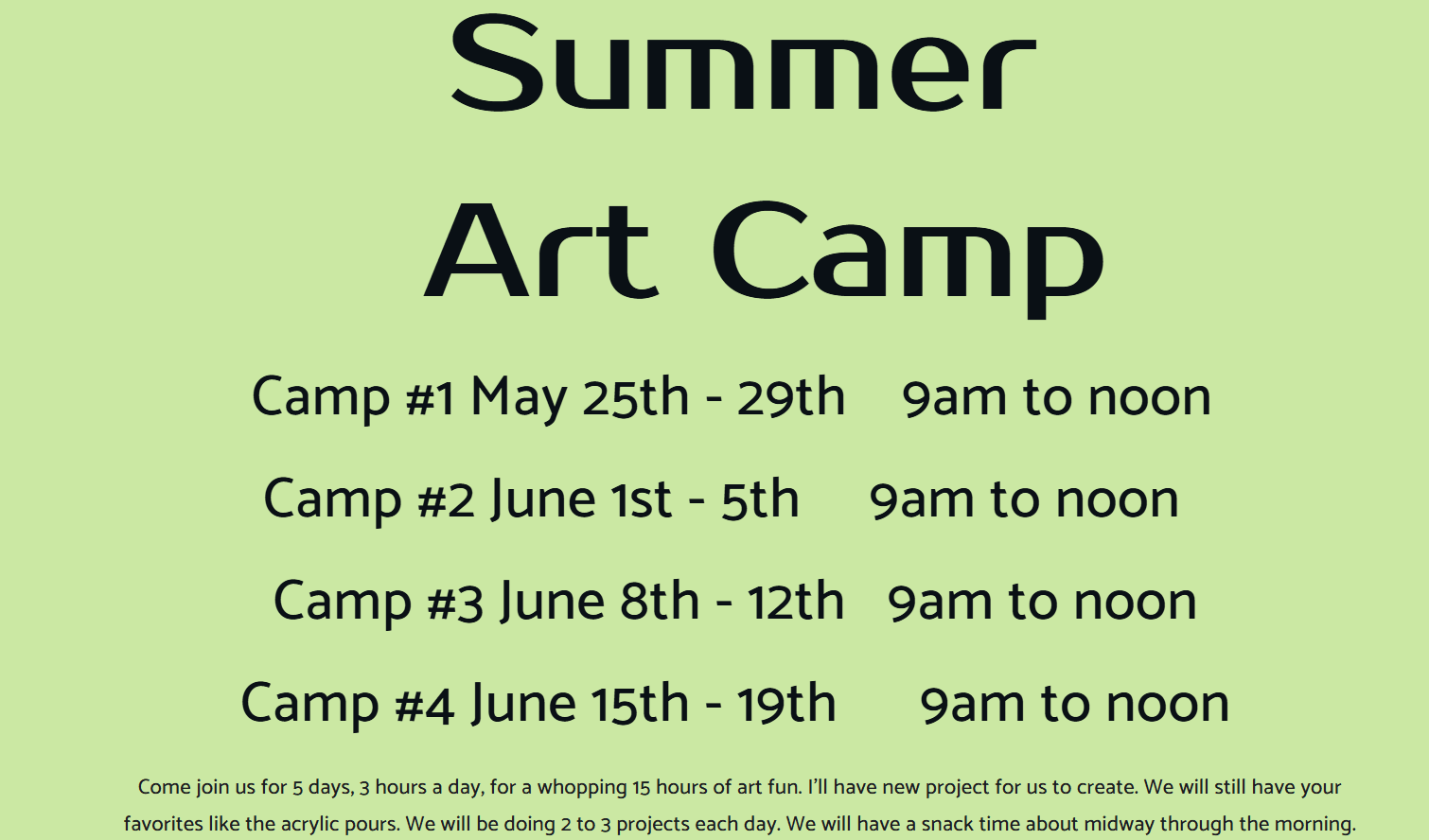Camp #1 May 25th - 29th 9am to noon Camp #2 June 1st - 5th 9am to noon Camp #3 June 8th - 12th 9am to noon Camp #4 June 15th - 19th 9am to noon Come join us for 5 days, 3 hours a day, for a whopping 15 hours of art fun. I'll have new project for us to create. We will still have your favorites like the acrylic pours. We will be doing 2 to 3 projects each day. We will have a snack time about midway through the morning. This art camp is for ages 6yrs and up. Cost is $180 per artist. Camp #1 and Camp #2 and any additional Summer art camps will all be the same projects. Additional Summer Art Camps are based on earlier camps being filled. These additional camp will just preceded to the following weeks. Spaces fill up quick. Call or text Scott Ashbrook at 740-403-4383Additional Info